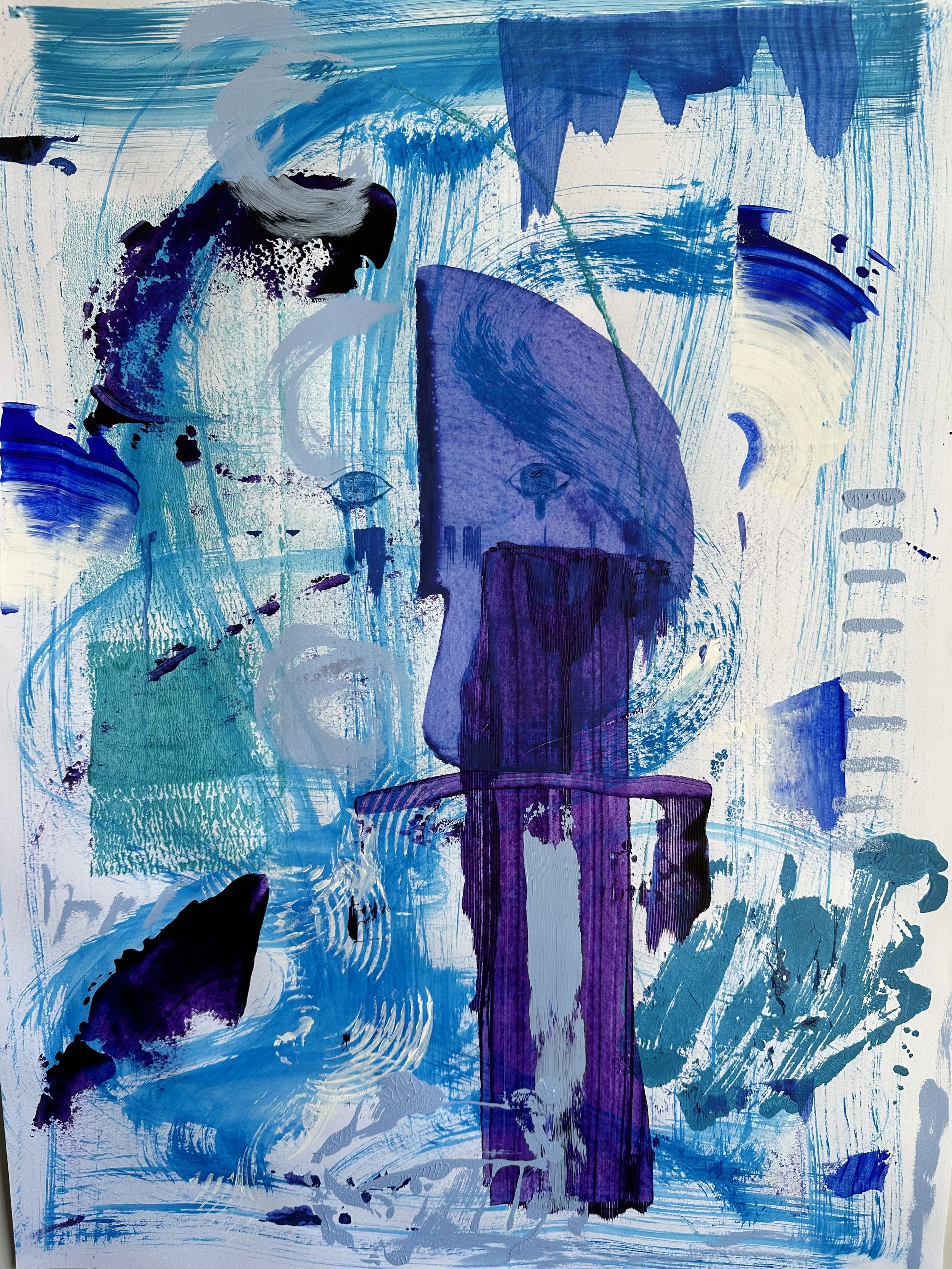 “Out of the Blue” (2025), Acrylic paint, ink pen, charcoal, 18” x 24”